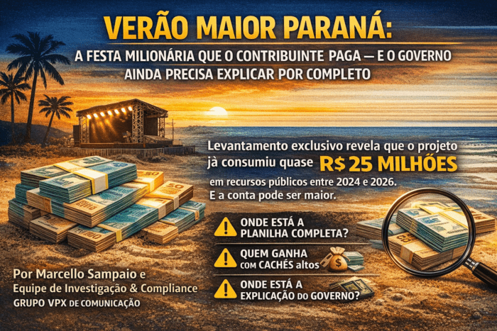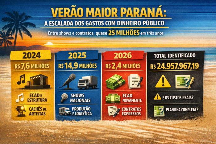 O Verão Maior Paraná, apresentado oficialmente como política pública de fomento ao turismo e à cultura, saiu de um modelo enxuto — baseado em kits esportivos, ações de saúde preventiva e atividades comunitárias — para uma estrutura marcada por contratos milionários, cachês elevados e custos operacionais robustos.