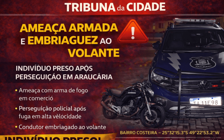 Indivíduo tentou fugir da Guarda Municipal, colidiu com viatura e foi preso por embriaguez ao volante Uma ocorrência grave mobilizou equipes da Guarda Municipal de Araucária no início da madrugada deste domingo (11), no bairro Costeira, envolvendo ameaça com arma de fogo, perseguição policial e embriaguez ao volante. De acordo com informações apuradas pela reportagem, …