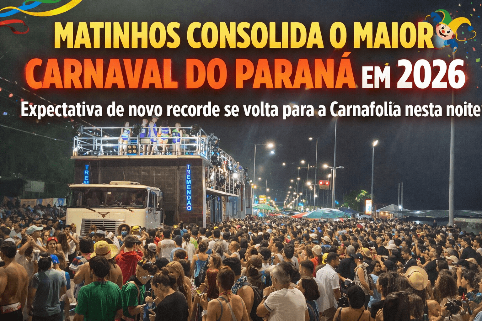 MATINHOS CONSOLIDA O MAIOR CARNAVAL DO PARANÁ EM 2026 E EXPECTATIVA É DE NOVO RECORDE COM A CARNAFOLIACom 660 mil foliões nos dois primeiros dias, cidade vive o auge da festa e se prepara para mais uma noite histórica nesta segunda-feira (16)
