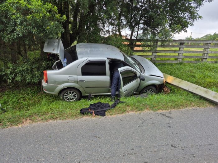 A equipe foi acionada pela central para atender um chamado na região rural do Guajuvira, onde um veículo havia colidido violentamente contra um poste. Ao chegarem ao local, os agentes encontraram o automóvel abandonado, com as portas abertas, o poste derrubado e nenhum ocupante nas proximidades.