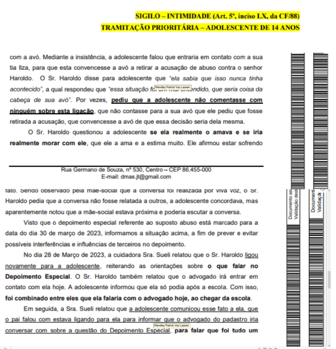 Entre os documentos analisados pela reportagem aparece um relatório de assistência social relacionado ao acompanhamento institucional da vítima. Esse tipo de documento costuma ser elaborado por profissionais especializados e integra procedimentos de proteção em casos de violência.