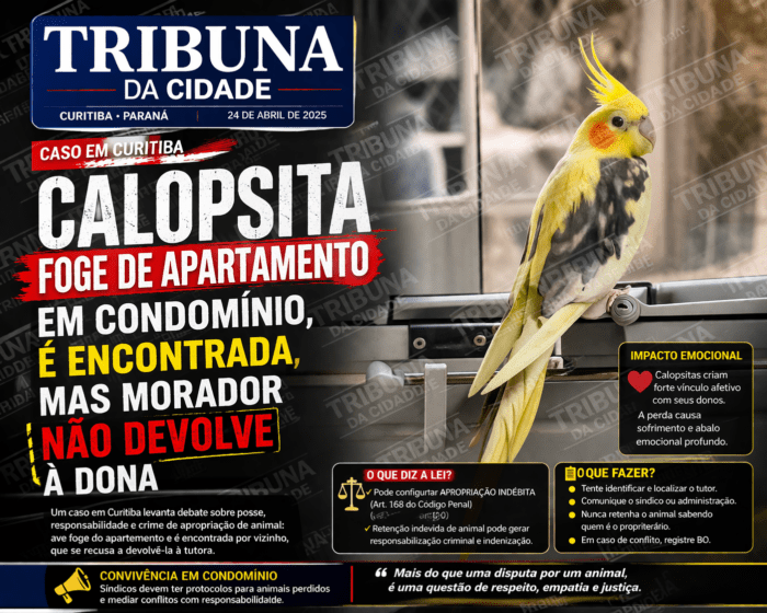 Um caso ocorrido em um condomínio residencial de Curitiba tem gerado forte repercussão, indignação entre moradores e discussão jurídica sobre posse, responsabilidade e limites da convivência em ambientes coletivos. Uma calopsita, criada como animal de estimação por sua tutora, fugiu do apartamento após uma abertura acidental e, embora tenha sido localizada pouco tempo depois, não foi devolvida à proprietária, dando início a um impasse que mobiliza vizinhos e repercute nas redes sociais.