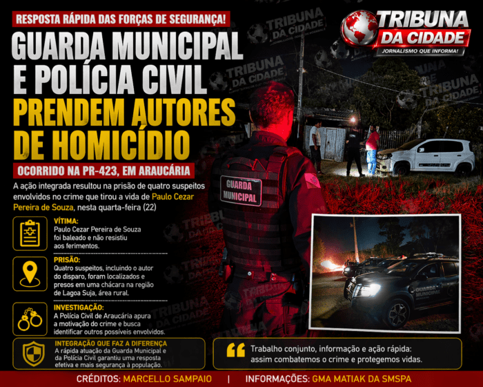 Uma operação integrada entre forças de segurança resultou na rápida prisão de quatro indivíduos suspeitos de envolvimento direto em um homicídio registrado na tarde desta quarta-feira (22), na região de Araucária. A ação foi conduzida pela Guarda Municipal em conjunto com a Polícia Civil, demonstrando eficiência na resposta ao crime e no trabalho de investigação imediata.